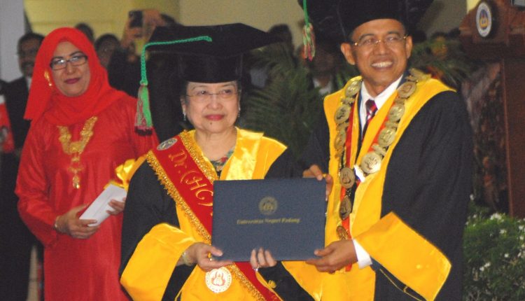 VIVA.co.id – Presiden kelima Republik Indonesia, Megawati Soekarnoputri, menerima gelar doktor kehormatan atau honoris causa bidang politik dan pendidikan dari Universitas Negeri Padang, Sumatera Barat, pada Rabu, 27 September 2017.